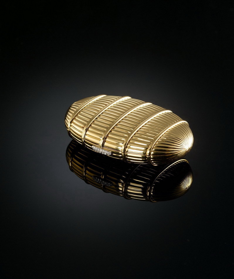 ??? 失竊展品——金嵌鉆石化妝盒。 作者:法勞內(nèi)。材質(zhì):金,白金,藍(lán)寶石(內(nèi)含金粉隔)。尺寸:9.72*6.23*2.8cm。時(shí)代:1970-1980年