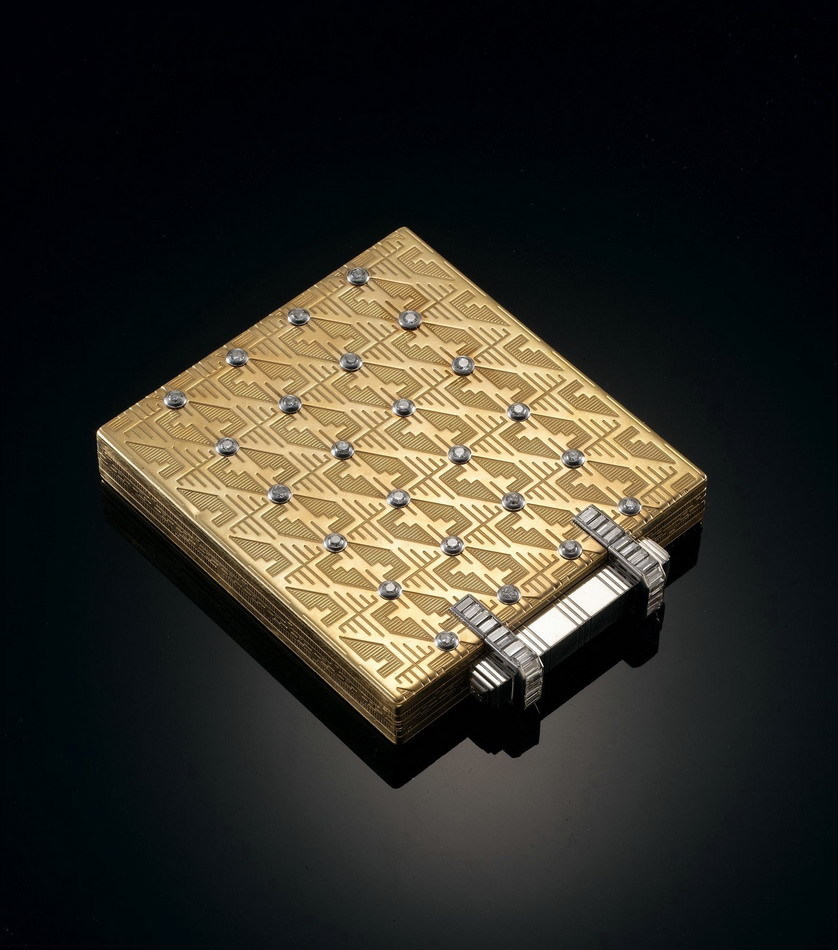 ??? 失竊展品——金鏨花嵌鉆石化妝盒。 作者:奧斯特塔格。材質(zhì):金,白金,鉆石。尺寸:7.2*5.9*0.7cm。時(shí)代:1930-1940年