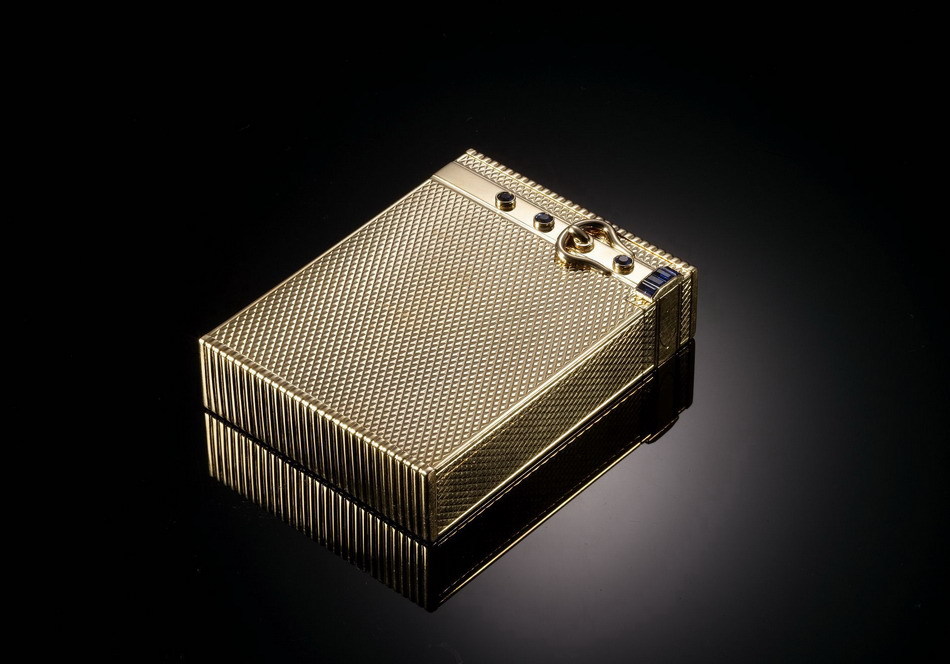 ??? 失竊展品——金嵌寶石化妝盒。 作者:愛(ài)馬仕。材質(zhì):金,藍(lán)寶石(內(nèi)含粉餅粉撲金唇膏)。尺寸:1.79*5.96*8.01cm。時(shí)代:1945-1955年