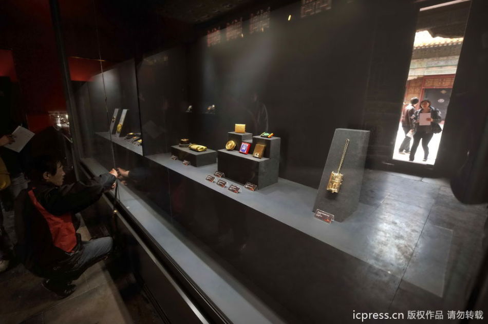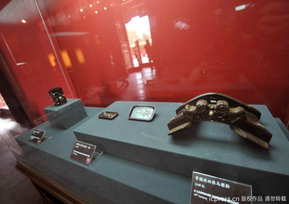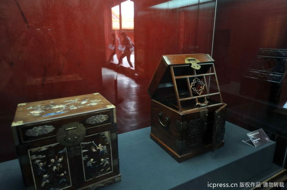 ??? 4月26日,北京,香港兩依藏博物館百余西式化妝盒藏品在故宮博物院齋宮開(kāi)展,此為其在世界范圍內(nèi)首度集中亮相。圖為19件(套)明清紫檀、黃花梨家具,陳列齋宮正殿。 |