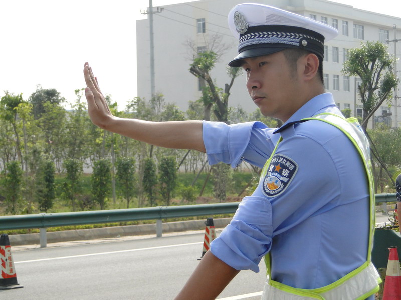 交警疏導交通,指揮過往車輛從改好的另一車道通過。