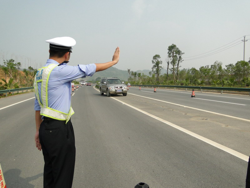 交警疏導交通,指揮過往車輛從改好的另一車道通過。