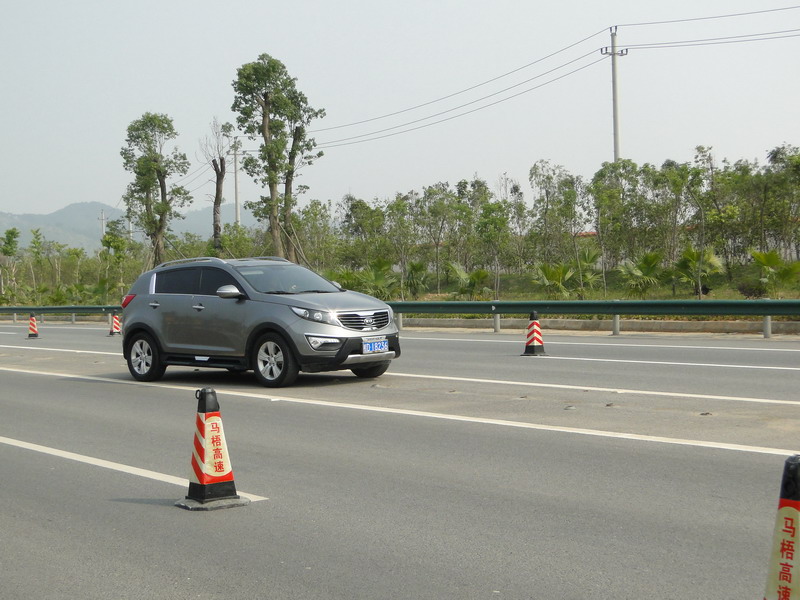 一輛小車在交警的指揮下改道行駛。