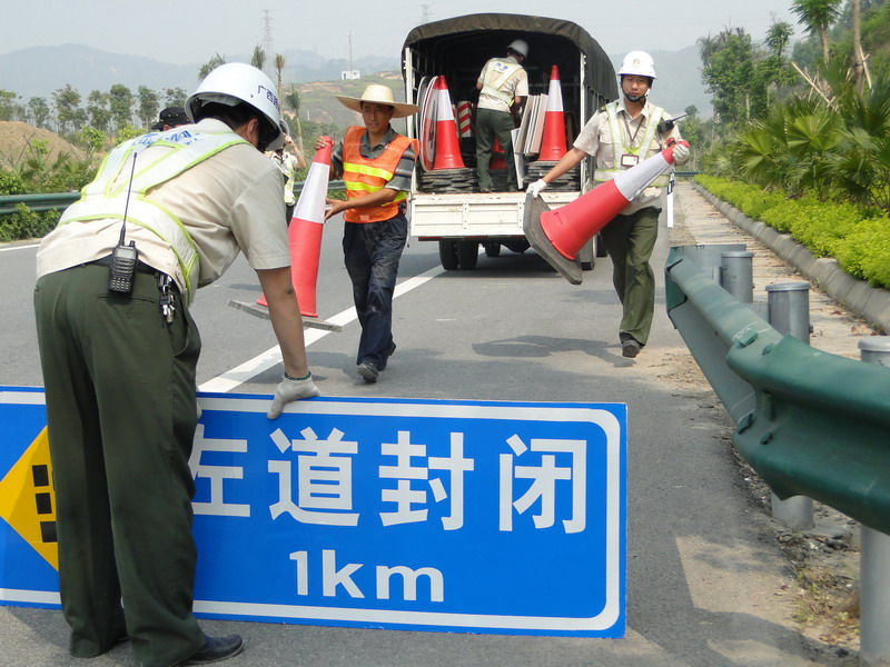 路政人員從右道改道終點通道前150~200M開始封閉超車道,并擺放有關標志和錐筒,提醒過往車輛左道已封閉。