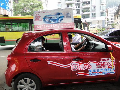 6月7日在梧州市鴛江麗港,一輛扎有黃絲帶的東風日產"愛心送考"車,正搭載著考生和家長前往考場。黃祎婧/攝