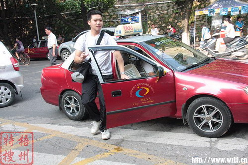 一位考生從愛心送考的出租車上下來。梧州特搜/攝