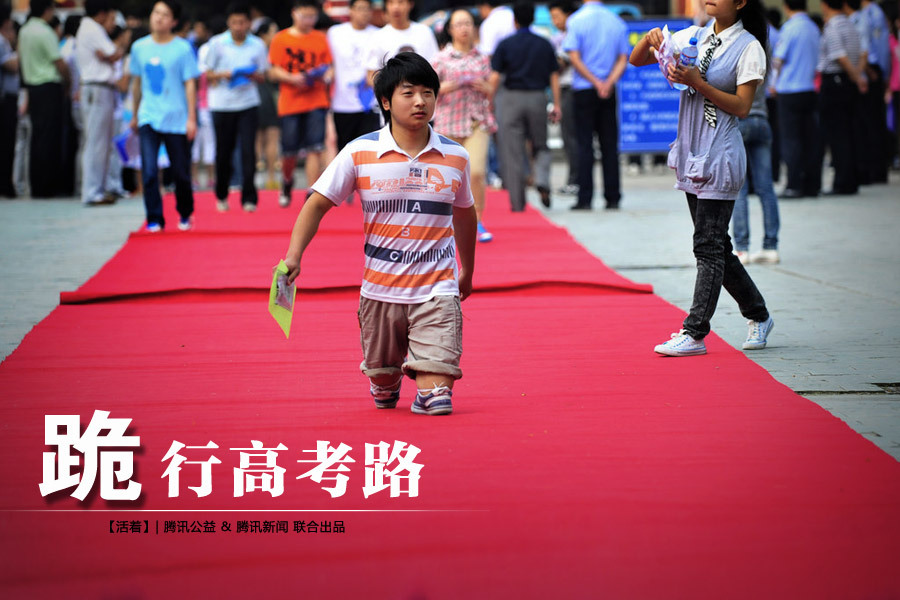 ????2011年6月7日上午8時30分,陜西漢陰縣中學(xué)考點,一位只有1.2米高的殘疾考生踏著紅毯,昂首“跪行”進入考場。他叫李衛(wèi),穿著鞋子卻沒有腳,憑著我們難以想象的毅力,一步步“跪”上高考的圣壇。鄧小衛(wèi) 圖/文
