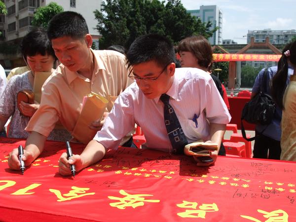 ??? 6月9日,梧州市餐飲服務單位食品安全168字誠信宣言簽名活動儀式在潘塘公園舉行,我市多家餐飲服務單位代表參與活動,簽署誠信諾言。