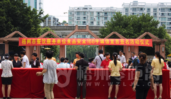 在梧州市餐飲服務單位食品安全168字誠信宣言簽名活動儀式上,餐飲單位代表做出了從我做起,從現在做起,確保人民群眾飲食安全的五點承諾: