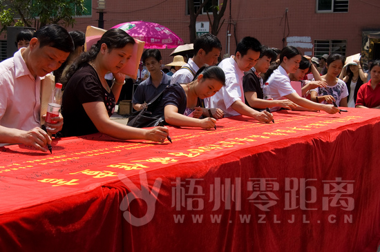 ??? 6月9日,梧州市餐飲服務單位食品安全168字誠信宣言簽名活動儀式在潘塘公園舉行,我市多家餐飲服務單位代表參與活動,簽署誠信宣言。