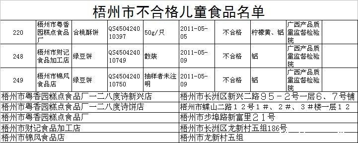 ????記者這份抽查公告中發(fā)現(xiàn),梧州市南順小站蛋糕店、正宏食品廠、桂香苑食品有限公司、康得利面包店、皇點(diǎn)蛋糕店、粵香園糕點(diǎn)食品廠、財(cái)記食品加工店、錦風(fēng)食品店等8家食品生產(chǎn)企業(yè)接受了抽檢。其中,梧州市粵香園糕點(diǎn)食品廠于5月5日生產(chǎn)的合桃酥餅中檸檬黃、鋁含量,財(cái)記食品加工店于5月9日生產(chǎn)的綠豆餅和錦風(fēng)食品店于5月9日出產(chǎn)的綠豆餅的鋁含量,均不符合國家強(qiáng)制標(biāo)準(zhǔn)。
