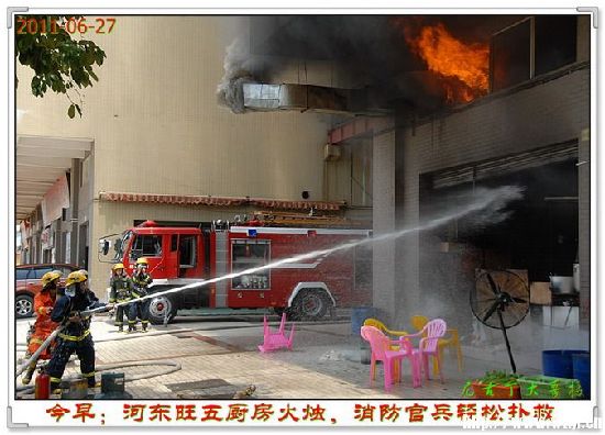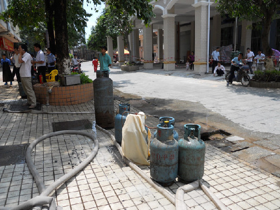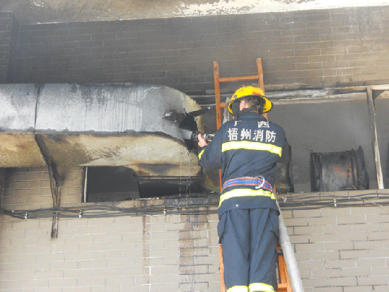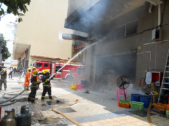 當天上午11時10分,梧州市公安消防支隊接到群眾報警電話稱:梧州市萬秀區(qū)西江路旺五飯店廚房發(fā)生火災(zāi),現(xiàn)場濃煙滾滾;情況非常緊急,接到報警后,市消防支隊立即調(diào)動河東消防中隊兩輛水罐消防車、10名官兵趕赴現(xiàn)場撲救火災(zāi)。在趕往現(xiàn)場的路上,消防官兵遠遠就看到現(xiàn)場的上空滾滾的濃煙漂浮在空中,到達現(xiàn)場后,消防官兵發(fā)現(xiàn),現(xiàn)場被大火與濃煙充滿了整個廚房,隨時有向上蔓延的可能,廚房門口外面堆放著幾個煤氣罐;據(jù)現(xiàn)場知情人員了解,火災(zāi)發(fā)生后,在廚房工作的人員第一時間把廚房內(nèi)的6個煤氣罐搬出來,但是不知里面是否還有煤氣罐,現(xiàn)場情況非常緊急,指揮員立刻下令展開滅火戰(zhàn)斗,幾分鐘后,大火得到有效的控制,經(jīng)過偵查沒有發(fā)現(xiàn)廚房內(nèi)部還有其他的煤氣罐。