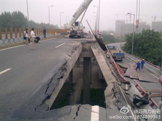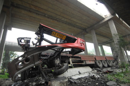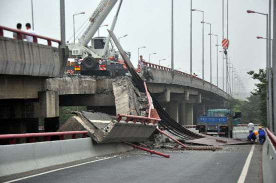 7月15日凌晨,杭州錢江三橋輔橋主橋面右側車道部分橋面突然塌落,一輛重型半掛車從橋面墜落,又將下閘道砸塌。