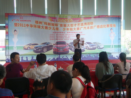 本網訊 (實習記者 楊靖)2011年7月16日,由廣汽本田廣梧4S店承辦的梧州“瑪麗婭”杯首屆大型才藝選秀活動暨2011中華環球大賽少兒組大賽(廣汽梧州賽區) 活動已在廣汽本田廣梧4S店隆重舉行,當天共有400多個家庭家長和孩子到場參加比賽,節目精彩紛呈,氣氛熱烈。