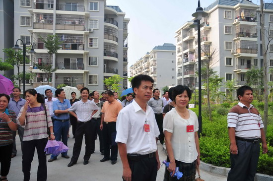 ????代表們走進栆沖安置社區(qū),參觀考察“安居工程”建設情況。