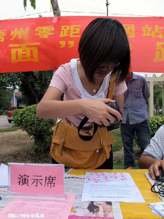 ????這樣的天氣也絲毫沒有影響蒼梧市民們參與活動的熱情。于是,在蒼梧縣政府廣場上,呈現出這樣一派場景:淅瀝的雨、火紅的橫幅,一邊是記者、一邊是市民。本不是圩日的廣場,卻顯得比圩日更熱鬧。