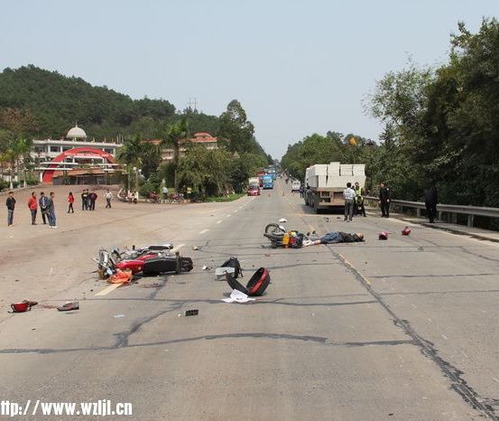 梧州零距離網(wǎng)訊(通訊員 胡紅 陸妙)3月25日,岑溪歸義思塘路段發(fā)生一起托車相撞、大貨車碾壓的交通事故,造成一人死亡,兩人受傷,兩輛摩托車嚴重受損。