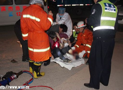 當日凌晨4時43分,岑溪市消防大隊接到報警,位于市北環大道原松香廠大門口處一輛摩托車發生事故,一位老婦人左腳卷入摩托車后輪。消防官兵立即出動,4時47分到場,只見一輛車牌為桂DMS980的二輪摩托車后座上坐著一位老婦,左腳膝蓋以下部位均被摩托車后輪以及鏈條等卡住,車身在兩名男子的支撐下斜臥于路面,厚厚的一層鮮血在摩托車底下流淌,先到場的交警和醫護人員已為傷者輸液止痛,并一直在安撫傷者,穩定其情緒。