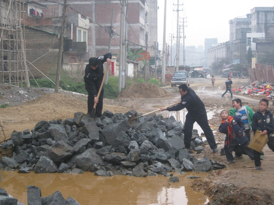“學(xué)生不能穿著跑鞋奔跑,不能平平安安上學(xué),一直牽動(dòng)著我們民警的心,我們有責(zé)任。”這是城東派出所教導(dǎo)員何本孟對(duì)筆者說道。 3月12日,城東派出所教導(dǎo)員何本孟在派出所周例會(huì)上,通報(bào)了潭津小學(xué)生上學(xué)難的情況,并提倡全所民警要向雷鋒同志學(xué)習(xí),切實(shí)解決村民、學(xué)生出行、上學(xué)難的實(shí)際問題。大家你一言我一語,民警們紛紛發(fā)言表態(tài)支持。最后,經(jīng)過會(huì)議的討論,民警一致贊同通過個(gè)人捐款購(gòu)買石料填平水窩,讓小學(xué)生高高興興、平平安安上學(xué)。 3月21日,派出所民警積極響應(yīng)號(hào)召,紛紛踴躍捐款,你一百我一百,用一千多元購(gòu)買了石料,雇請(qǐng)車輛,民警借來鐵鍬,人人出力將水窩填平了。從此,在通往潭津小學(xué)的路上,我們?cè)僖部床坏侥且坏赖腊枷莸乃C。民警的“學(xué)雷鋒”精神,切實(shí)解決了小學(xué)生上學(xué)難的問題。