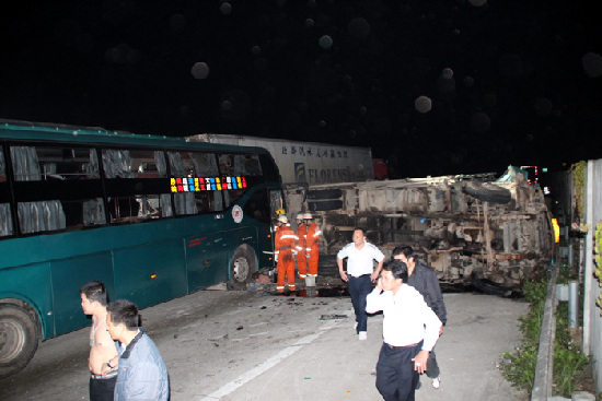 現(xiàn)場一輛粵S75336的大客車與牌照為桂KA063掛的掛車追尾后黏在一起,旁邊一輛車牌為桂J02837的運雞貨車橫亙于兩車交接部位,三車前方20米左右的地方停放著一輛被追尾的大貨車。此時的事故現(xiàn)場灑滿了雞籠和汽車殘骸碎片,數(shù)百只雞滿地亂竄。