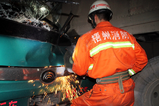4月3日23時55分,岑溪市消防大隊接到報警,稱南梧高速路岑溪市中林服務(wù)區(qū)附近發(fā)生車輛追尾事故。消防官兵立即出動并于次日零時18分到達現(xiàn)場。