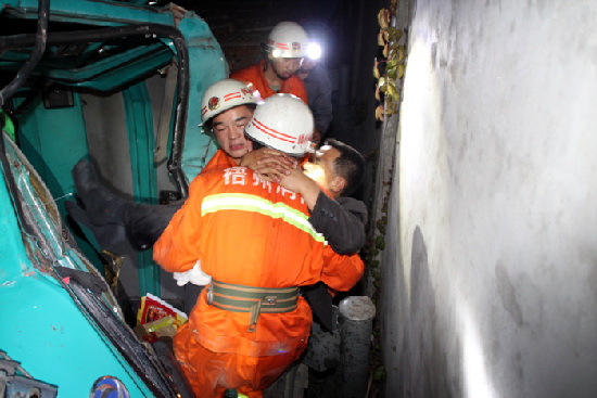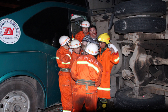 經(jīng)過消防官兵仔細搜尋發(fā)現(xiàn),大客車司機和運雞貨車司機兩人受困于駕駛室,其余人員均安全逃生撤離,消防官兵立即將運雞貨車司機救出并交予醫(yī)護人員治療。由于大客車車頭深深的陷入掛車尾部,司機左腿嚴重被夾,救援難度較大,經(jīng)過多方測試,救援人員決定利用切割機、液壓鉗、撬棍等工具,采取破拆客車車頭底部移開車內(nèi)雜物的方法營救司機。1時58分,客車司機被救出,至此兩名受傷被困的司機全部救出并送往當?shù)蒯t(yī)院治療。