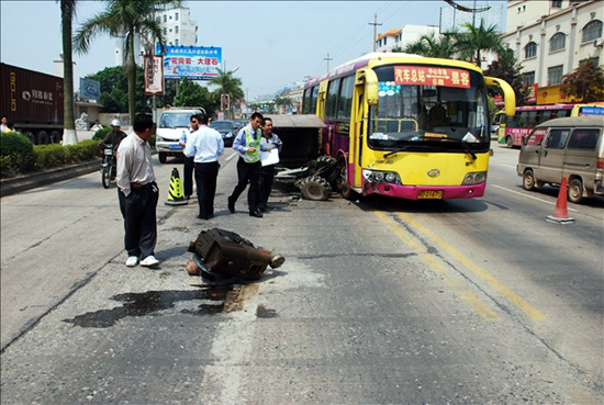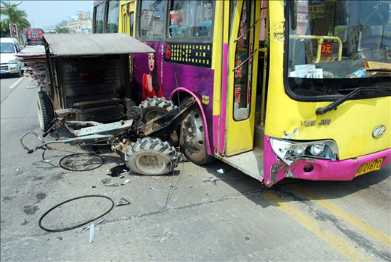岑溪市玉梧大道一拖拉機機頭被一公交車撞飛