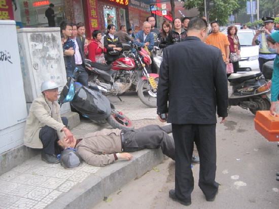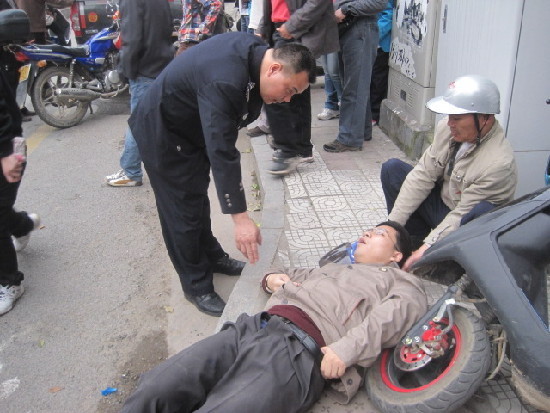 3月27日17時(shí)50分,在梧州市新興二路國(guó)恒電器商場(chǎng)對(duì)出非機(jī)動(dòng)車(chē)道,一名騎電動(dòng)車(chē)的年輕男子突然倒地,口吐白沫,抽搐休克,疑似癲癇病發(fā)作。大塘派出所接警后,所長(zhǎng)莫林清與協(xié)警鐘澤明迅速趕到現(xiàn)場(chǎng),發(fā)現(xiàn)該男子不省人事,馬上撥打120請(qǐng)求救護(hù)車(chē),并配合醫(yī)護(hù)人員把男子送往市紅會(huì)醫(yī)院救治。
