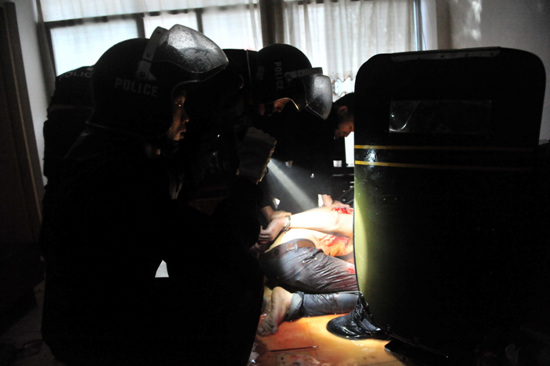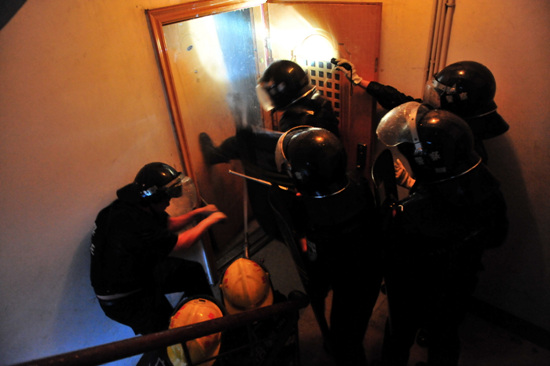 為確保人民群眾生命財產(chǎn)安全,現(xiàn)場處置組在反復(fù)多次察看現(xiàn)場地形和調(diào)查走訪后,決定采取先談判后強攻的形式進行處置。在民警聯(lián)同犯罪嫌疑人家屬與犯罪嫌疑人進行談判未取得進展后,現(xiàn)場處置組果斷采取強攻方式,實施抓捕。特巡警支隊組成的突擊隊在強行撞門過程中,由于犯罪嫌疑人持菜刀、木棍以及引爆煤氣罐相威脅,民警在勸阻無效的情況下果斷開槍射擊,擊中犯罪嫌疑人右胸并成功將其抓獲,人質(zhì)獲安全解救,整個處置過程持續(xù)1 5分鐘。目前,犯罪嫌疑人已送醫(yī)院救治(暫無生命危險),受傷民警也已送往醫(yī)院救治(無生命危險)。