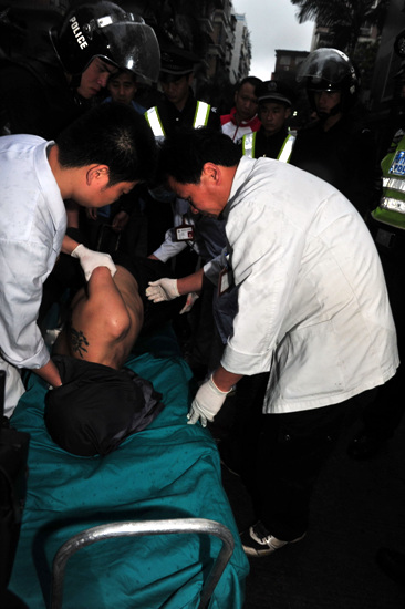將犯罪嫌疑人蘇某帶離現(xiàn)場送醫(yī)院救治。梁觀遠 攝