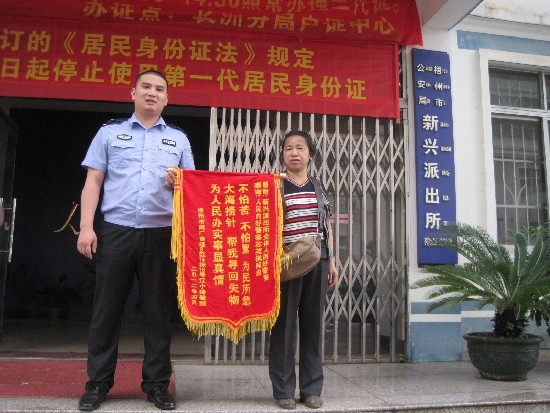 4月20日上午,失主江女士專程來到新興派出所送上錦旗,向幫助挽回巨額損失的民警表示感謝。錦旗上寫著:不怕苦 不怕累 為民所急,大海撈針 幫我尋回失物 為人民辦實(shí)事顯真情。感謝新興派出所全體人民好警察、感謝人們的好警察蘇英祺同志。