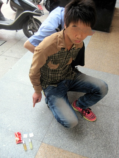 4月20日晚,紅樓派出所所長梁志成帶領民警在萬秀區西江二路某量販式KTV樓下對出路面伏擊守候。至21日凌晨,一名型跡可疑的男青年進入民警視線,只見該男青年在某量販式KTV樓下來回走動,觀察周圍,還不停打電話,一直沒有上KTV的跡象。多年辦案經驗告訴民警,這名男青年可能有問題。與此同時,伏擊民警又在附近發現另一名可疑男青年,該人神情緊張四處張望,還不時用手觸摸褲袋。梁志成果斷決定,馬上組織伏擊民警分別對兩名男子進行檢查、盤問。