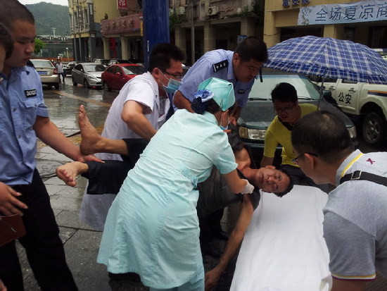 只見老漢半臥半趴地靠著路邊電線桿暈迷不醒,臉色發青,雙眼緊閉,口中還不時地吐著清口水。雨水打在他的身上,老漢不停地顫抖著。民警見狀,一邊用手機撥手120,請求救護車到場救助,一邊從車里拿出雨傘,和經過的熱心小伙子一起,為老漢擋住打在其身上的雨水。兩分鐘后,救護車趕到現場,孟警官協助醫生、護士們將老漢扶上擔架,送往醫院救治。 |