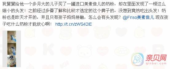 網(wǎng)友“PeNg-Hu1”在微博上爆料在美素佳兒內(nèi)發(fā)現(xiàn)頭發(fā)(親貝網(wǎng)配圖)