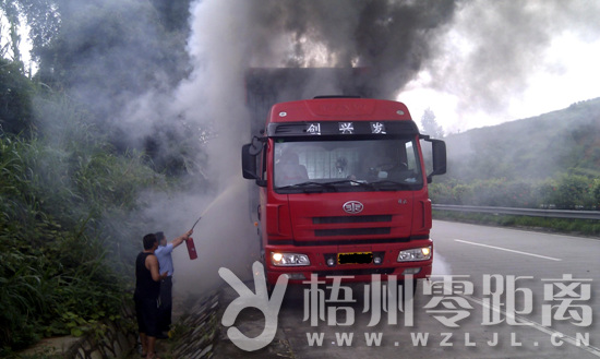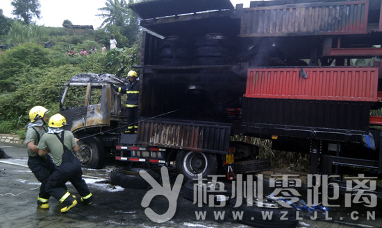 梧州零距離網訊(通訊員 蘇延炎)7月29日,梧州市公安局交警支隊高速公路管理三大隊民警在執行日常巡邏任務,當民警驅車巡邏至包茂高速下行線2839公里處時,發現上行線有一輛牽引掛車停在應急救援車道上直冒濃煙,于是巡邏民警馬上停車跨過中間防護欄到自燃貨車現場做好安全防護工作,一面將情況匯報大隊領導。同時,通知路政、岑溪交警大隊和消防部門前來做好防護和救火工作。
