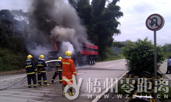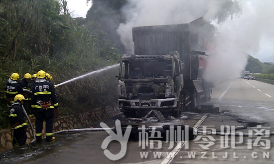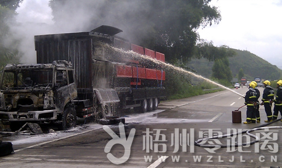 10時05分,高速三大隊巡邏民警趕跨過護欄跑到自燃貨車旁首先向司機確認沒有人員傷亡,并且馬上撥打119火警電話通知消防部門前來救火,同時拿出巡邏車上的滅火器對著火的貨車輪胎進行滅火,由于火勢太猛,滅火器用盡也不能阻止火勢向車頭蔓延,一股股黑煙沖向十幾米的高空。為了防止出現意外,巡邏民警迅速在來車方向擺放錐筒,封閉行車道,同時疏散旁邊圍觀的村民,做好現場安全防護工作和交通疏導工作。隨后路政、岑溪交警大隊和消防等部門及時趕到,大家各司其職,很快就將貨車上的大火撲滅。