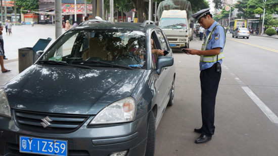 8月23日,我市公安交警支隊在鴛江麗港中心廣場啟動“集中整治機動車涉牌涉證違法行為”專項行動,交警正在檢查一粵Y牌小車。據(jù)交警介紹,檢查車牌的駕駛證、行駛證以及保險外,還會對比車牌號碼是否與登記的一致,如有可疑,將通過警務(wù)通進一步查詢是否涉牌涉證違法行為。