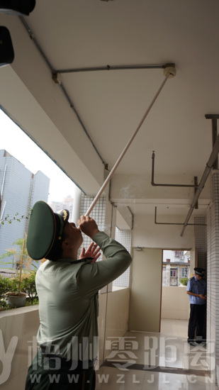 ??? 在振興小學教學樓內,為檢查消防噴淋設備是否有效,檢查組人員向消防噴淋設備吹煙,隨后學校值班室收到消防報警。覃燕霞 攝