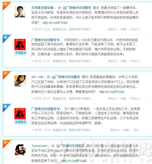 在微訪談期間,網(wǎng)友提問熱情高漲,使得原定一小時的訪談,延至一小時十五分。在一個多小時的時間里,網(wǎng)民提出了90多個問題,涉及道路交通、戶籍政策、治安秩序、偵查破案、網(wǎng)絡(luò)詐騙和隊伍管理等方面,補副市長現(xiàn)場回復(fù)20個。通過微博互動,開放、開明、誠懇、坦率的交流方式受到廣大網(wǎng)友的好評,許多網(wǎng)友對訪談內(nèi)容給予了轉(zhuǎn)載,有的網(wǎng)友也期許這樣的活動能夠持續(xù)開展下去。“網(wǎng)絡(luò)是一個很好的交流平臺,我們作為社會治安的管理部門,交流互動是很有意義的,這樣我們可以多渠道的傾聽民聲。”訪談結(jié)束后,補副市長表示,對因時間關(guān)系未給予回復(fù)的問題,將通過市公安局新浪官方微博——“廣西梧州在線警務(wù)”由專門的微博值班民警向網(wǎng)友回復(fù)。