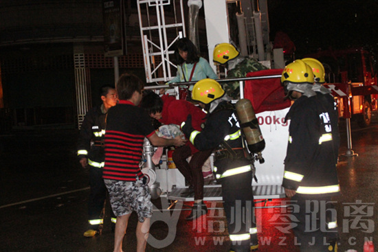 梧州零距離網(wǎng)訊(通訊員 李正文 林耀永)11月11日凌晨,岑溪市某停業(yè)KTV起火,8人被困在6樓,消防搜救人員全副武裝快速進入樓內(nèi)搜救被困人員并將8人轉(zhuǎn)移至頂樓,最后由消防云梯車將受困者全部救下。