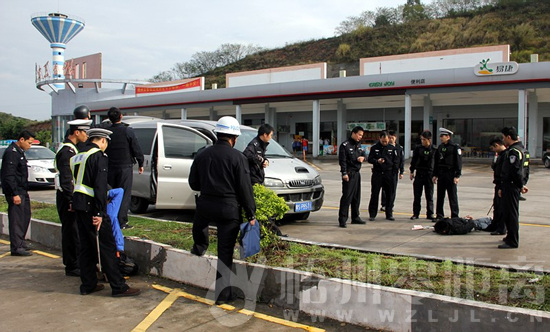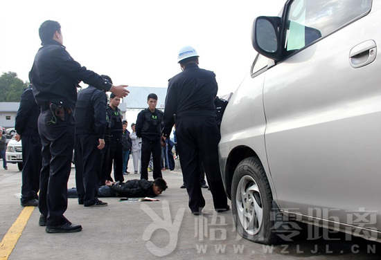 很快,一輛灰色面包車高速朝收費(fèi)站方向飛馳而來(lái),后面一輛廣東牌照的警車呼嘯著警笛緊緊跟著,面包車駕駛員見(jiàn)前面收費(fèi)站有警察嚴(yán)陣以待,無(wú)路可逃之際轉(zhuǎn)彎駛?cè)肱赃叺姆?wù)區(qū),車一停下兩男子打開(kāi)車門奪路而逃。民警見(jiàn)狀立刻徒步飛奔過(guò)去,和廣東牌照警車下來(lái)的民警一道對(duì)兩嫌疑人展開(kāi)圍捕,很快,經(jīng)過(guò)抱膝摔等幾招漂亮的擒拿動(dòng)作,兩名嫌疑人被警察制服按倒在地,抓捕行動(dòng)順利完成。