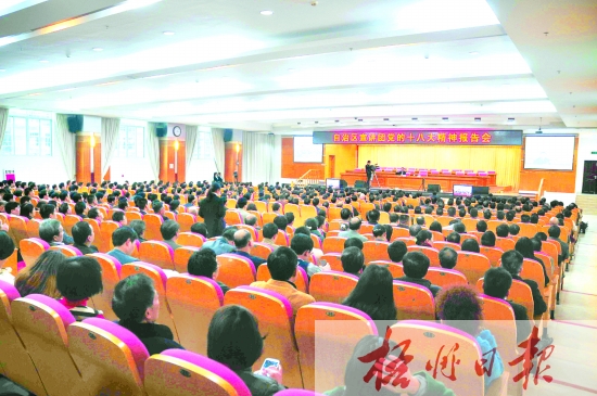 ????12月4日下午,自治區(qū)宣講團(tuán)在我市舉行學(xué)習(xí)貫徹黨的十八大精神報(bào)告會(huì)。報(bào)告會(huì)以電視會(huì)議的形式舉行,各縣(市)設(shè)分會(huì)場(chǎng)。 李煜榮/攝
