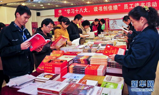 ????11月26日,國家電網天津城東供電分公司員工在企業活動室選購圖書。當日,國家電網天津城東供電分公司將新華書店請進企業,開展為期一周的“學習十八大讀書創佳績”員工讀書活動,讓電力員工不出單位便可及時便捷選購黨的十八大文件及最新學習輔導讀物。 新華社記者 張超群 攝