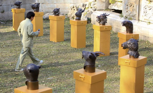 ????【2012年10月30日,圓明園海晏堂,成龍走向擺放好的獸首。當日,成龍把他主導重塑的新十二生肖獸首捐贈給圓明園,市民以后可到此一睹十二生肖獸首的風采。】據了解,由成龍導演兼主演的電影《十二生肖》將于12月20日全球上映。10月30日,成龍在北京圓明園舉辦了盛大的獸首回歸發布會,現場向圓明園管理處捐贈了精確復原的影片道具“新十二生肖獸首”,以此呼吁更多人銘記歷史,保護中華文物。道具“新十二生肖獸首”是在冷貝生提供的全套圓明園十二生肖獸首仿品的基礎上,成龍劇組耗時三年臨摹,并進行藝術加工而成。