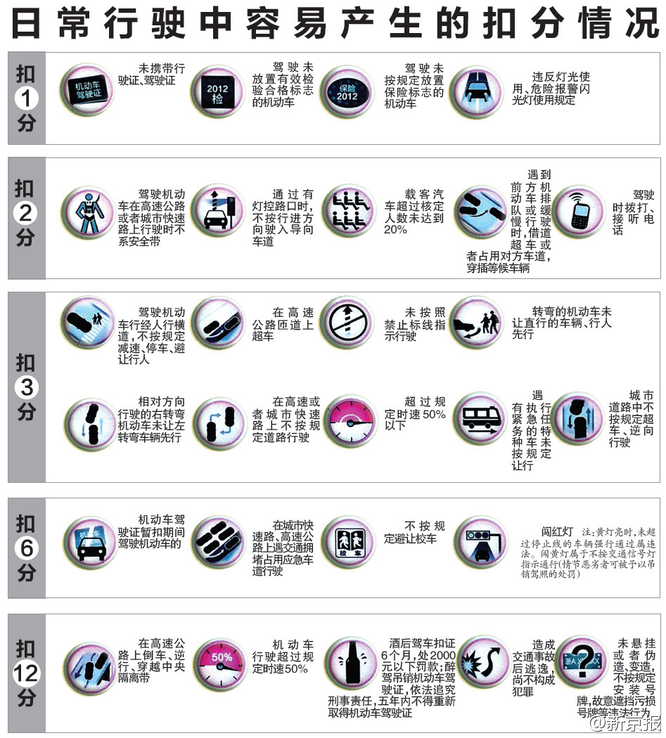 ????公安部“123號令”除了對酒后駕車、事故逃逸等嚴重交通違法行為一次扣12分外,一些不文明行車行為也納入扣分細則,如駕駛時撥打接聽電話扣2分,駕駛二輪摩托車不戴安全頭盔的扣2分,遇到執行緊急任務的特種車未按規定讓行扣3分,行經人行橫道不避讓行人扣3分,不按規定避讓校車扣6分……