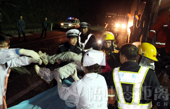 事故發生后,梧州市公安局黨委委員、交警支隊支隊長唐劍鋒高度重視,啟動應急預案,立即調派高速、蒼梧交警趕赴現場展開救援、疏導和分流,并趕赴現場一線指揮施救;聞警而動的消防和醫療、路政等部門人員也迅速到位,經過近一個小時的緊張施救,成功將被困傷員救出,并送往醫院接受進一步治療。