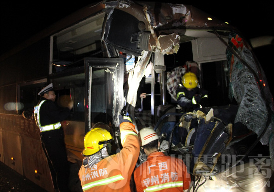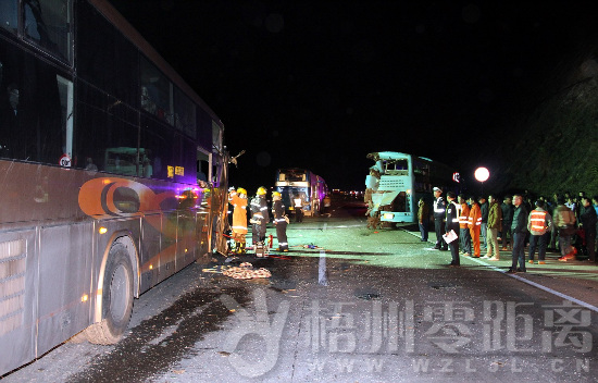 據了解,事故發生于包茂高速蒼梧岑溪段距新地出口3km往梧州方向。筆者在現場看到,撞碎的車窗玻璃和零件灑滿一地,兩輛粵A粵B車牌的小轎車一左一右橫在路面,粵A轎車后面有兩輛大客車追尾碰撞,首尾相“吻”,右邊一輛桂A車牌的藍色大客車“屁股”被撞掉一半,前輪陷入路邊溝渠,排在最后方的金色粵S車牌大客車被撞得最嚴重,車頭右側呈粉碎狀,且有一乘客的大腿卡在駕駛室旁無法動彈,其時,消防官兵正在利用破拆工具對事故車進行破拆解體。