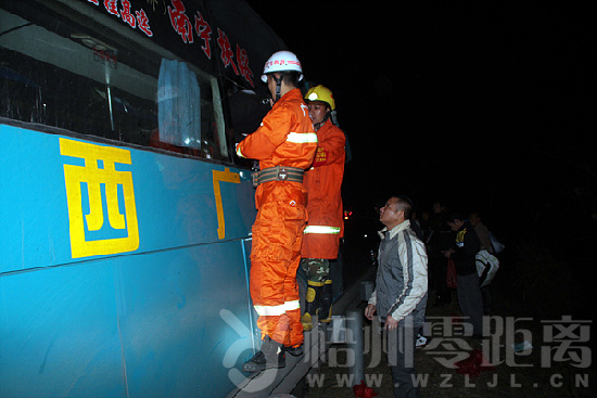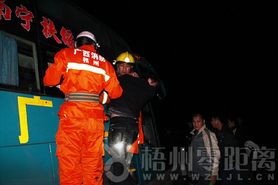 梧州零距離網(wǎng)訊(通訊員 林桂生)3月4日晚,一輛開往廣東中山的大客車途經(jīng)廣西梧州市境內(nèi)時(shí),與一輛大貨車發(fā)生追尾,造成車上45名乘客全部被困。經(jīng)消防官兵救援,至5日凌晨,被困大客車的45名乘客被成功疏散至安全地點(diǎn),事故無人員傷亡。