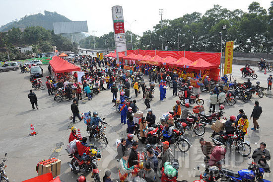 今年春運經(jīng)梧州交警支隊積極協(xié)調(diào),梧州市人民政府將東出口春運服務(wù)站作為民心工程,由市政府牽頭、各部門密切配合、社會各界力量積極參與、志愿者駐站服務(wù),為返鄉(xiāng)鐵騎大軍提供姜茶,漢堡包、八寶粥、方便面等免費食物和免費醫(yī)療服務(wù),同時還有手機充電、Wi-fi無線上網(wǎng)、親情電話等供返鄉(xiāng)鐵騎休憩使用。梧州市參照東出口春運服務(wù)站模式,在務(wù)工人員返鄉(xiāng)路途中的蒼梧、藤縣國道卡口設(shè)立春運服務(wù)站,在三個服務(wù)站之間的中石化、中石油加油站廣場設(shè)立春運服務(wù)點,在每個服務(wù)點之間設(shè)立流動服務(wù)車,通過流動服務(wù)車,將服務(wù)點、服務(wù)站串連起來,點、線、面結(jié)合,最大限度的覆蓋返鄉(xiāng)摩托大軍的返鄉(xiāng)路線,確保“鐵騎行千里、愛心不掉隊”。據(jù)統(tǒng)計,春運期間,梧州各個春運服務(wù)站服務(wù)返鄉(xiāng)、返程摩托大軍約有50萬輛次。在1月25日至2月9日,進入梧州春運服務(wù)站休息的返鄉(xiāng)鐵騎日均超過3000多輛次。梧州春運服務(wù)站溫馨貼心的服務(wù)溫暖著鐵騎的漫漫返鄉(xiāng)路,這凸顯了政府對道路交通安全管理工作的重視,體現(xiàn)了政府對返鄉(xiāng)務(wù)工人員的人文關(guān)懷,展現(xiàn)梧州市互助、友愛、包容、奉獻的人文精神。