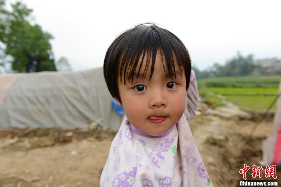 4月21日,四川雅安蘆山縣龍門鄉(xiāng)一位在簡(jiǎn)易帳篷外玩耍的小孩。中新社發(fā) 張?jiān)?攝